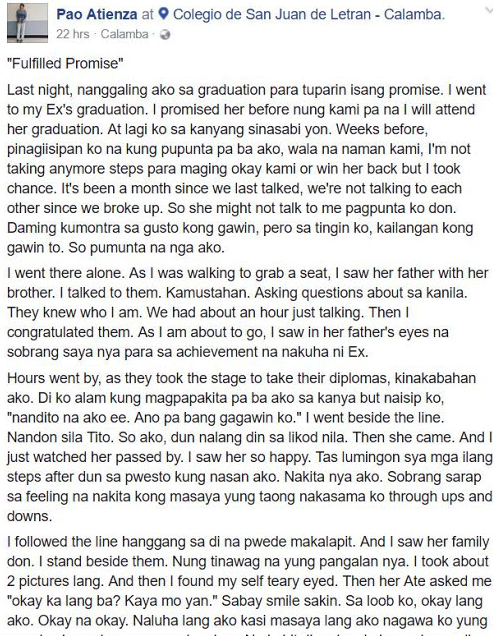 Si Pao Atienza ay nagpromise sa kanyang girlfriend na umattend sa kanyang graduation. Ngunit, nang maghiwalay sila ay hindi niya binigo ang ex-girlfriend nya dahil tinupad niya ang pangako niya na pumunta sa graduation niya at lumikom lang naman ito ng mga positibong reaksyon sa socmed mula sa ating mga netizens.