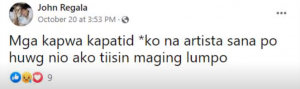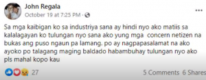 After two days on October 22, John Regala expressed his frustr@tion with his colleagues in the industry as if he had not received any help. He said “Mga kapatid ko sa industria ngaun ko napatunayan na wala kayong pag ibig sa akin”.