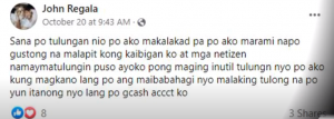 He added, “ako po ay na accidente na balian po ako ng gulugod at kapag hindi na opearhan ako po ay malulumpo habng buhay. alam ko po mabububuti ang iyong kaluoban at hindi niyo ako tatangihan sa aking kahilingan magtulong tulong nmaan po tayo ma opearahan upang muling makalad ayaw ko pong pumanaw na inutil lalo na sa mga harapan ng mga taong akala ko ay habang buhay kong makakasama. bigyan niyo naman ako kunting dignidad ako’y nag susumamo don bilang John Regala karapatdapat naman ako sa respetong yan. sana po mapukaw ang inyong damdamin na d lng isa ka John Regala mang yari ang mga bagay na ito kundi sa lahat. wag nating pabayaan ang mag ka isa tayo na anak ng mga tunay na artista at tunay na ank ng isang tunay na malalim na artistang pilipino